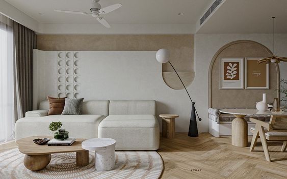 Untuk gaya scandinavian, gunakan material kayu terang dan warna lembut seperti putih, beige, atau abu muda.